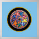 A hand painted geometric mandala featuring spiralling layers of unfolding rainbow coloured petals over an indigo coloured universe circled by a rich gold border.
