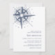 Coastal chic bridal shower invitation features a vintage hand drawn nautical compass rose illustration in harbour blue, with your bridal shower details in classic navy blue. Perfect for beach, summer, or nautical theme bridal showers, these coastal style invitations reverse to wide horizontal stripes in harbour blue and white.