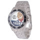 Has heft and feel of expensive stainless steel quartz watches. Good band with safety catch. I removed links, which is easy because engraved arrows show direction to push the linking pins. As always by this seller, the image (a railroad logo) is a perfect reproduction of my emailed image, and is precisely spaced and aligned.