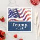These Donald Trump 2024 presidential campaign party napkins have a blue background with a faded American flag covering the top portion. The bottom half features the phrase "Trump 2024" printed in a regal, sophisticated, white font.