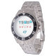 Has heft and feel of expensive stainless steel quartz watches. Good band with safety catch. I removed links, which is easy because engraved arrows show direction to push the linking pins. As always by this seller, the image (a railroad logo) is a perfect reproduction of my emailed image, and is precisely spaced and aligned.