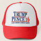 Buy a red white and blue Trump Pence 2016 'Make America Great Again' campaign trucker cap and support Donald Trump for president! Featuring the words, Trump and Pence in a bold blue text, '16 in red, centred on the front of the hat, and the 'Make America Great Again' saying below in blue text. Choose from different hat colours and get yours today.