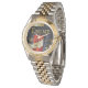 The watch is very nice, the picture is great and the watch looks like quality. The only problem I am having with it is that it is a little too large, and I also can't figure out how to open the clasp. No directions came with it. Very good. The printing is perfect and the watch keeps good time.