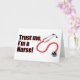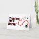 Humourous greetings card with a silver and red stethoscope design next to the words “Trust me I'm a nurse”. It would also be ideal for someone who recently graduated out of Medical School. Customising: You can choose a different design, add your own text or images, or resize the current design, by clicking on the ‘Customise it’ button. If you cannot see the product or design you’re looking for, contact us using the ‘contact’ button beneath any product description to discuss your requirements.