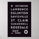 Toronto Transit Commission rollsign style poster. Features stops along the Yonge subway line. List of stations on poster: "Southbound" signage, Lawrence, Eglinton, Davisville, St. Clair, Summerhill, Rosedale, "Exit and Buses" signage.