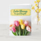 This design shows a tall bouquet filling the lower half of the card, with pink and yellow tulips rising among softer peach and blush flowers whose frilled petals open to small yellow centers 🌷. Deep green stems and leaves gather tightly at the base, creating a lush foundation against a bright off‑white background. Above the flowers sits a long, horizontal label in butter‑yellow with a lightly brushed edge, outlined in emerald green. Centered inside that label, the message “Easter Blessings to a special Daughter” appears in deep green lettering, standing out clearly against the warm yellow. The gentle, diffused light gives the petals a velvety look and lets the greens appear crisp, like a fresh spring morning. The close clustering of blooms and the soft color pairing suggest a tender bond, like a caring note shared between family or close friends 🐰. Subtle shadows fall behind the bouquet, and the yellow label floats neatly above it with its green border sharply defined.