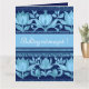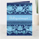 This large greeting card, inspired by Hungarian tulip chest motifs, features a design in dark and light blues with a rustic touch. The card includes the message "Boldog Névnapot!" which translates to 'Happy Name Day.' Created in collaboration with Magic Media AI and Hungarian designer Alma Wad.