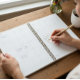 Un planificateur de mariage avec une belle couverture représentant deux tulipes délicates dans les tons bleu de Delft, symbolisant l'amour et les nouveaux départs. Les noms des mariés, écrits élégamment en calligraphie fluide, occupent le devant de la scène, créant une touche personnelle et romantique
