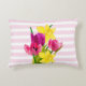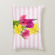 Décorez votre maison avec ce joli coussin à motifs floraux printaniers. Cet accent coussin est composé d'un arrière - plan rayé rose pastel et blanc avec une superposition de tulipes et de jonquilles. Un coussin gai pour votre chambre ou salon. Parfait pour le printemps, Pâques et la fête des mères.