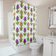 This shower curtain has an art deco design made from diamonds, triangles, and polygons making tulips in orange and purple with green stems and leaves.