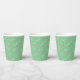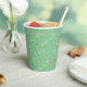 Tulips and butterflies green pattern paper cups. Design features pink, yellow and orange tulips on a green background. Pink and yellow butterflies frolic around the tulips, enhancing the joyful aesthetic with a whimsical touch!