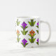 Cette tasse a un design art déco fait de diamants, triangles et polygones qui fabriquent des tulipes en orange et violet avec des tiges vertes et des feuilles.