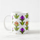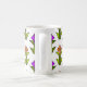 This mug has an art deco design made from diamonds, triangles, and polygons making tulips in orange and purple with green stems and leaves.