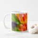 Colourful tulips on a flowerbed. Virtually all the rainbow colours present. Bright and positive floral scene. Macro photography.