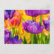 Colourful violet, purple, pink tulips on a flowerbed. Virtually all the rainbow colours present. Bright and positive floral scene. Macro photography.