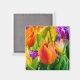 Colorful tulips on a flowerbed. Virtually all the rainbow colors present. Bright and positive floral scene. Macro photography.