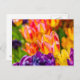 Colourful tulips on a flowerbed. Virtually all the rainbow colours present. Bright and positive floral scene. Macro photography.