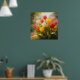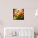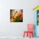 Artwork of tulips blooming in a forest in a painterly style. This radiant artwork captures a vibrant bouquet of tulips basking in the golden glow of early morning sunlight. The dappled light filters through the background trees, highlighting the delicate texture of the petals and the rich green of the leaves. The artwork features a variety of tulip colors including red, yellow, orange, white, and pink, set against a soft, sunlit forest background. The lighting is warm and golden, highlighting the textures of the petals and stems. It feels like a window into a perfect garden day, bringing a sense of warmth and cheer to any home decor. A wonderful gift for gardeners, nature lovers, or anyone who needs a daily reminder of sunshine in their lives.