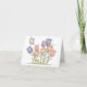 A whimsical note card of a bunch of tulips with a butterfly and ladybug.