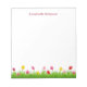 A collection of spring bulb blooming tulips in green grass in shades of pink and yellow. Personalize with your name in pink purple font.