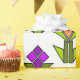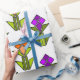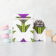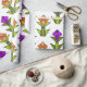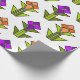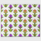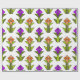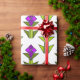 This wrapping paper has an art deco design made from diamonds, triangles, and polygons making tulips in orange and purple with green stems and leaves.