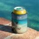 Can cooler with a beautiful photo featuring Tulum, Mexico. Turquoise waters on a sandy shore. Wind swept palm trees blowing in the breeze near a craggy cliff side. Awesome memento.