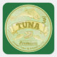 A pop-up style illustration of the lid of a tuna can. This is drawn in vector and has the look of a retro advertising poster. It has tuna fish on it and is drawn in times of green and yellow. A design for anyone who loves canned / tinned fish.