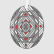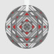 A concentric square mandala takes on the appearance of a tunnel that draws the viewer in with a combination of angled lines, triangles, and circles in shades of grey, red, and white to almost create an optical illusion.