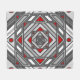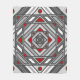 A concentric square mandala takes on the appearance of a tunnel that draws the viewer in with a combination of angled lines, triangles, and circles in shades of grey, red, and white to almost create an optical illusion.