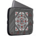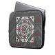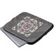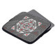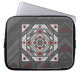 A concentric square mandala takes on the appearance of a tunnel that draws the viewer in with a combination of angled lines, triangles, and circles in shades of grey, red, and white to almost create an optical illusion.