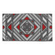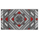 A concentric square mandala takes on the appearance of a tunnel that draws the viewer in with a combination of angled lines, triangles, and circles in shades of grey, red, and white to almost create an optical illusion.