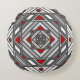 A concentric square mandala takes on the appearance of a tunnel that draws the viewer in with a combination of angled lines, triangles, and circles in shades of grey, red, and white to almost create an optical illusion.