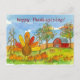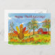 A cute holiday Happy Thanksgiving postcard decorated with a whimsical turkey with colourful feathers in the pumpkin patch with a red barn and autumn trees drawn in pen and ink with watercolor.