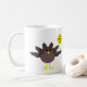 This stylish mug features a funny cartoon of a turkey with big black eyes, a small yellow beak and tail feathers sticking up. The feet are facing in opposite directions making the turkey look clumsy. The turkey is holding a yellow balloon with a message inside that says “it’s turkey time”. This is a fun thanksgiving party design.