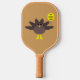 This awesome Pickleball Paddle features a funny cartoon of a turkey with big black eyes, a small yellow beak and tail feathers sticking up. The feet are facing in opposite directions making the turkey look clumsy. The turkey is holding a yellow balloon with a message inside that says “it’s turkey time”. This is a fun thanksgiving party design.