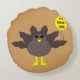 This awesome round pillow features a funny cartoon of a turkey with big black eyes, a small yellow beak and tail feathers sticking up. The feet are facing in opposite directions making the turkey look clumsy. The turkey is holding a yellow balloon with a message inside that says “it’s turkey time”. This is a fun thanksgiving party design.