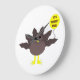 This awesome clock features a funny cartoon of a turkey with big black eyes, a small yellow beak and tail feathers sticking up. The feet are facing in opposite directions making the turkey look clumsy. The turkey is holding a yellow balloon with a message inside that says “it’s turkey time”. This is a fun thanksgiving party design.