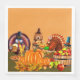 Cute Thanksgiving scene with a couple turkeys and a bear wearing Pilgrim hats. One turkey has a big stein of beer and another a pie. In front is a cluster of pumpkins, apples, nuts and golden leaves.. Other matching items available