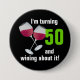 Turning 50 and wining with red wine glasses 3 inch round button