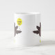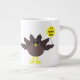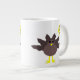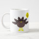 Cette énorme tasse présente un drôle de dessin d'une dinde aux grands yeux noirs, un petit bec jaune et des plumes de queue qui s'accrochent. Les pieds sont orientés dans des directions opposées, ce qui rend la dinde maladroite. La dinde tient un ballon jaune avec un message à l’intérieur qui dit "c’est l’heure de la dinde". C'est un design de fête de grâce amusant.
