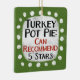 Un drôle de design typographique qui dit "Turkey Pot Pie : Can Recommend, 5 Etoiles". C'est du texte en noir et rouge sur un rectangle blanc avec des points blancs amusants autour, le tout sur un arrière - plan vert.