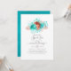 Summer sip and see invitation featuring turquoise and coral roses and tropical faux glitter foliage with elegant handwriting typography.