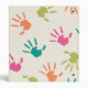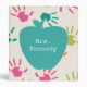 A gift for teachers featuring an illustration of a turquoise apple over a background of multi colour handprints. Personalize with your name.