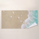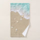 Beautiful turquoise beach waves rolling up on soft beach sand covered in pretty seashells decorate this towel set.