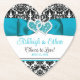 These personalized and romantic paper coasters for a wedding are perfect to use at your reception, bridal shower, or rehearsal dinner for whatever beverages or cocktails you are serving. These heart shaped black and white damask pattern wedding coasters are sure to be a memorable hit with your guests and are another way to keep a cohesive look throughout your wedding celebrations. The heart shape design area of these paper coasters has a turquoise ribbon and bow image with joined hearts images across the top. Below the ribbon, the words, "Cheers to Love!" are printed in black script with the names of the happy couple and the wedding date printed in turquoise blue and black. If you need any other matching items, please email niteowlstudio@gmail.com and watch your spam/junk folders for my reply, or use the Zazzle chat feature to contact me.