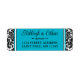 These black and white damask pattern wedding return address labels have a damask pattern on the left and right sides with the text area in turquoise or teal blue with black and white edges in the centre that match the wedding invitation set below. Your name(s) and return address are in black with an ornate black scroll divider between them.
