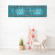 Elegant Quinceañera banner done in a turquoise blue satin looking background with graphics of silver garlands of flowers, along the top and bottom. Personalize the white text for your daughter's special day. Great for Sweet 16 parties too.