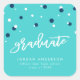 Stylish graduation sticker featuring the word "Graduate" in a trendy white brush script against a turquoise background with white and blue confetti scattered on top. Use it to seal your envelopes, favour bags or for decoration.