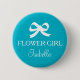 Personalized aqua / turquoise blue and white flower girl name badge buttons with little bow tie ribbon and elegant font. Great for fancy bachelorette party, classy bridal shower, fun girls weekend and beautiful weddings. Classy round design. Posh and cute pins! Make your own for chic brides maid, maid of honour, matron of honour, flowergirl, mother of the bride, mother of the groom and other members of brides entourage etc. Wedding planner accessories for bride's crew. Customizable colour.