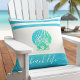 “Beach life”. Whenever you relax on this seaside throw pillow, you can be rest assured the summer seashore fun will continue. A graphic, turquoise blue green ombre vintage seashell overlays a white background with sandy textured turquoise blue stripes. Both indoor and outdoor fabric choices available. Great for the family beach house, your nautical lifestyle, or just to bring a bit of the beach into your home all year round!